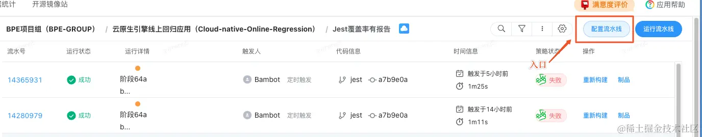 入口:流水线列表或流水线构建记录页,点击“配置流水线”