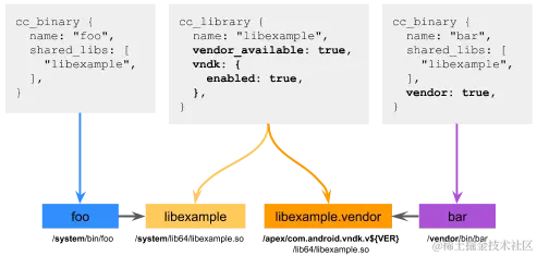 | llndk | 由Google维护,被系统和供应商镜像共同使用,可以双重加载 | system | llndk_library { name: "libThatIsLlndk", ... } |
