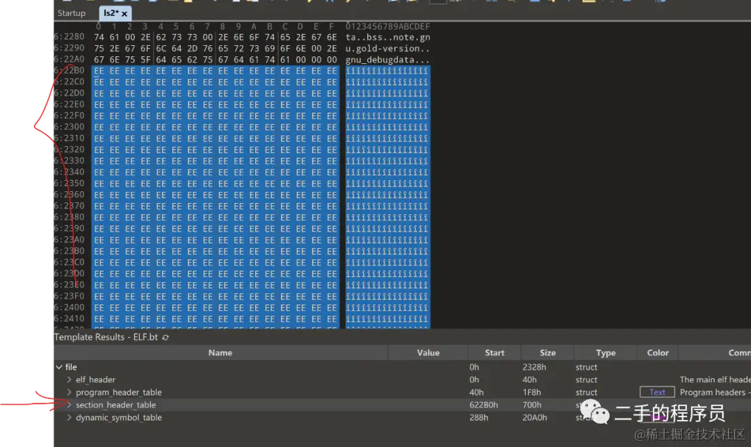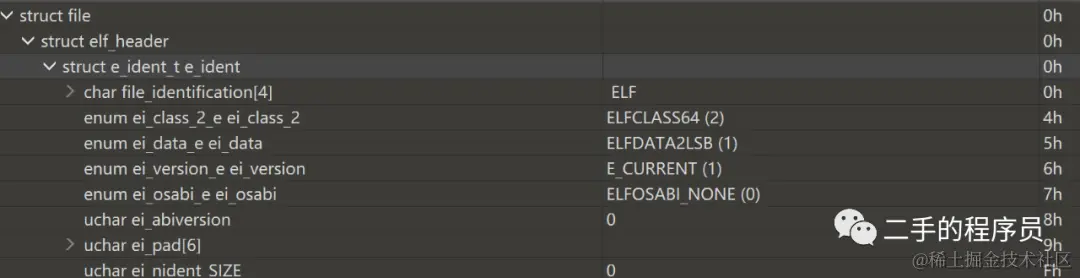 elf_header 下有一个子结构体,e_ident_t,这里面其实就第一个 file_identification 有用,它是固定的,为 .ELF。