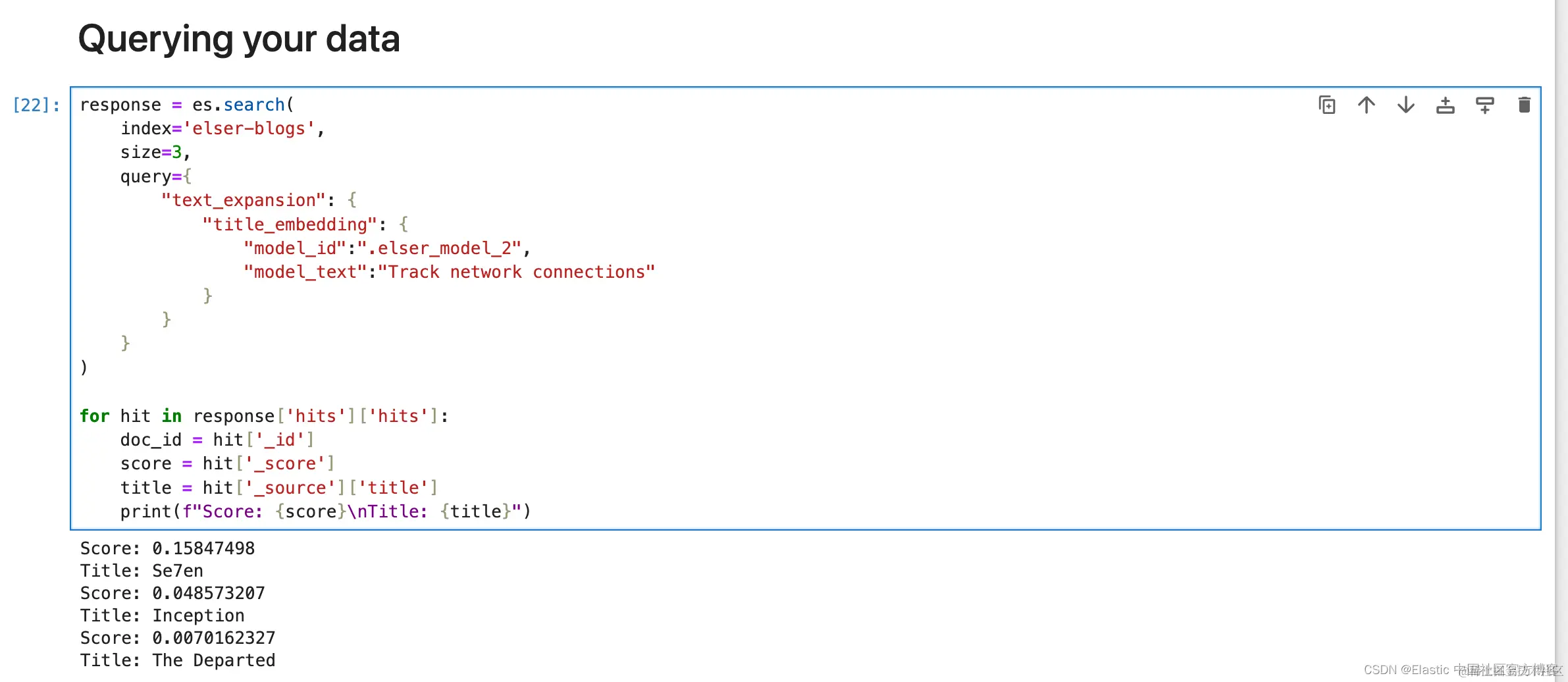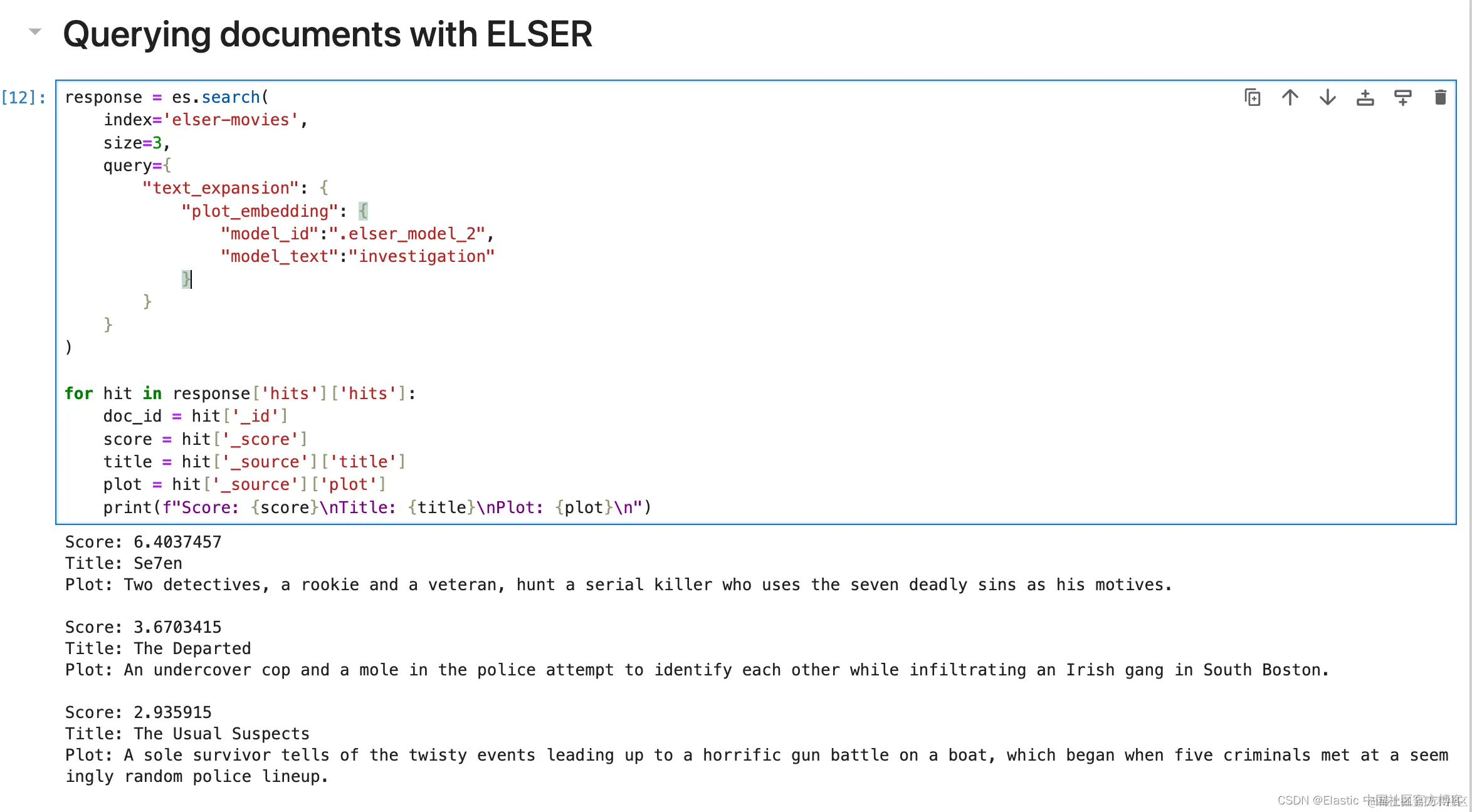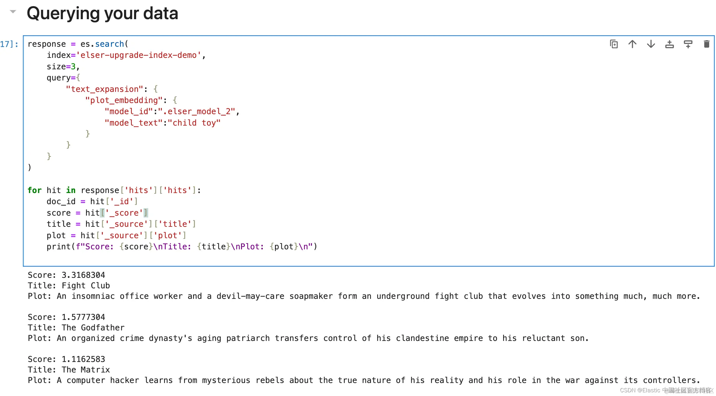 为了演示的目的。我们使用上一步中得到的 elser-movies 来进行练习。我们假定它是有 .elser_model_1 所生成的(尽管它是由 .elser_model_2 模型所生成的)。我们使用如下的代码: