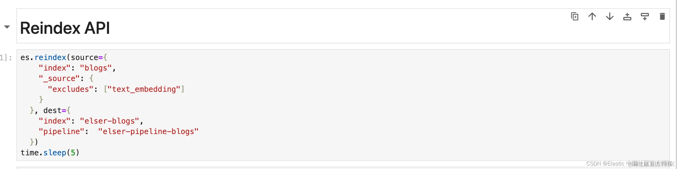 我们将使用 Reindex API 复制数据并生成 text_expansion 嵌入到我们的新索引 elser-blogs 中。