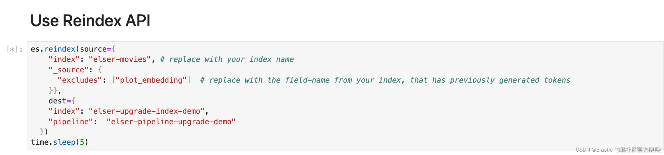 我们将使用 Reindex API 将数据从旧索引移动到新索引 elser-upgrade-index-demo。 我们将从旧索引中排除 target 字段,并在重新索引时使用 .elser_model_2 在字段 plot_embedding 中生成新 token。