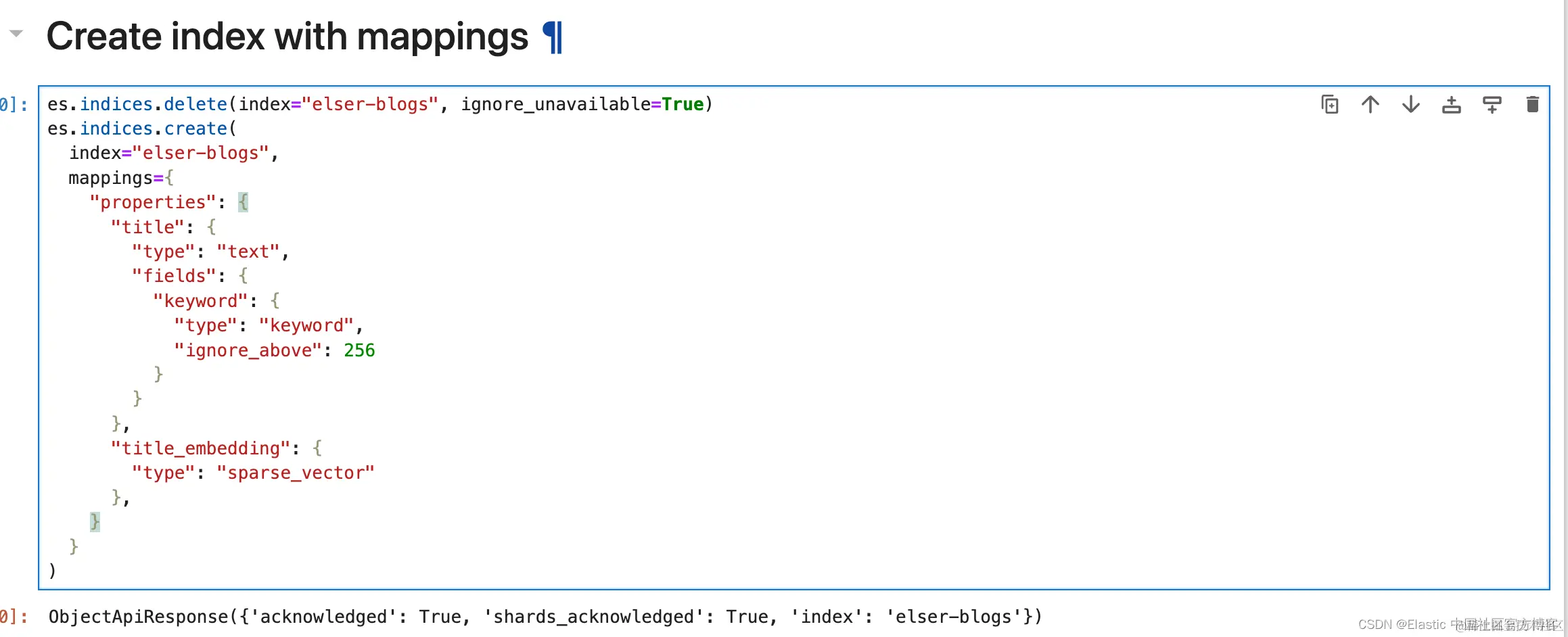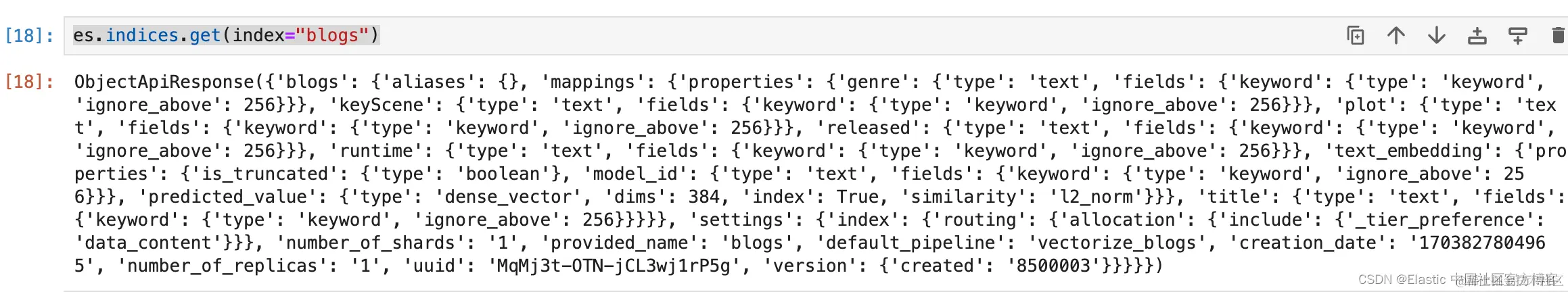 注意字段 text_embedding,我们将在新索引中排除 (exclude) 该字段,并根据博客索引中的字段 title 生成新映射