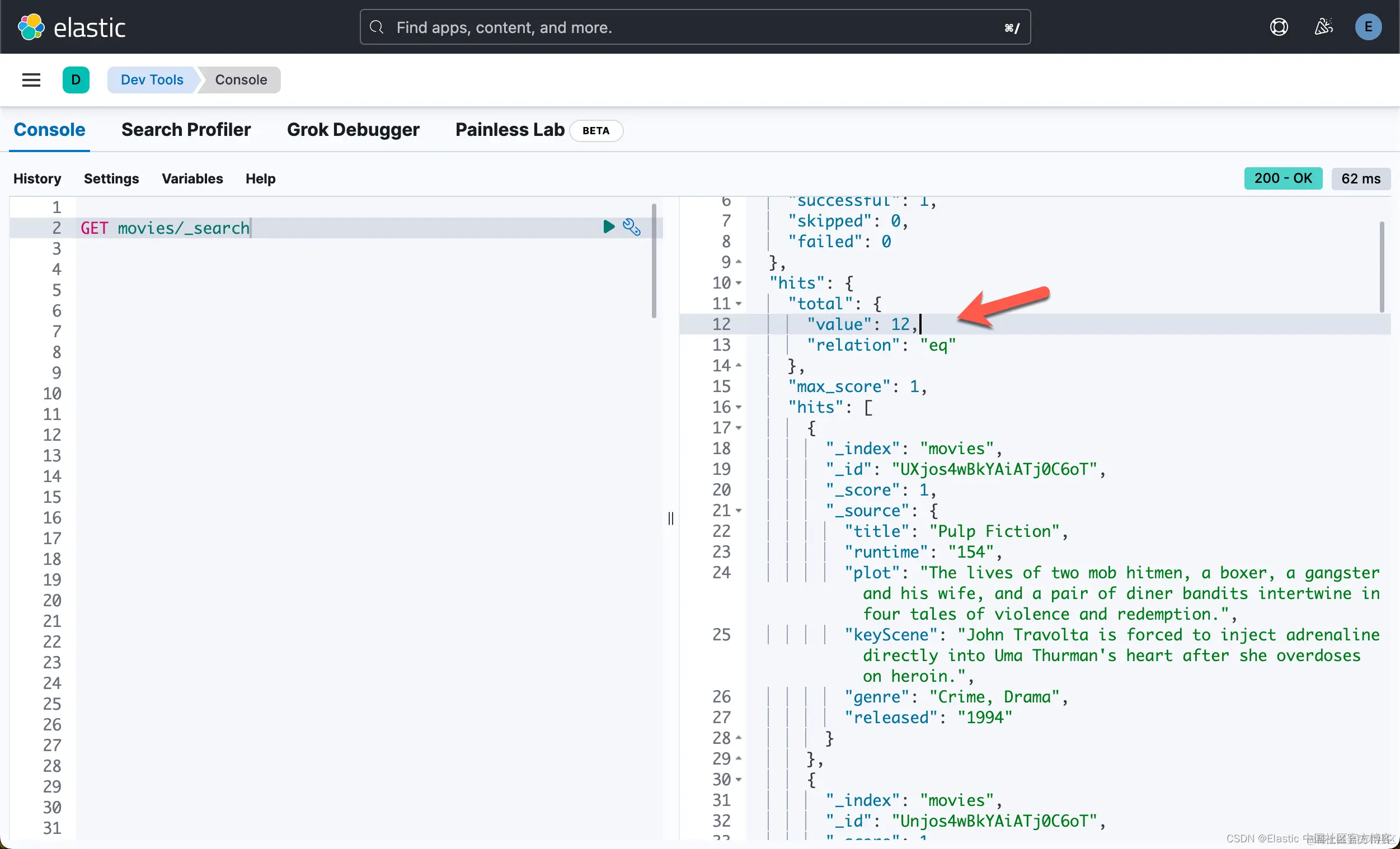 重新索引完成后,检查索引 elser-movies 中的任何文档,并注意到该文档有一个附加字段 plot_embedding,其中包含我们将在 text_expansion 查询中使用的术语。