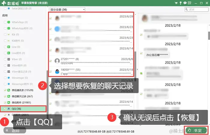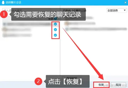 步骤3:勾选需要恢复的聊天记录,然后点击右下角的**【恢复】**按钮即可。