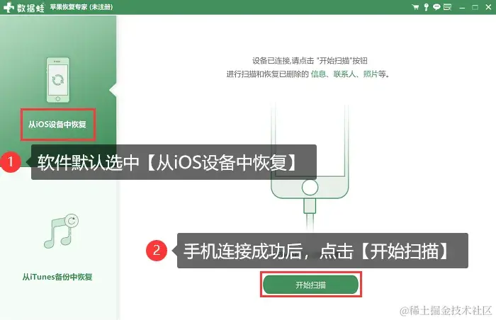 步骤2:请注意,在使用电脑恢复聊天记录时,请确保手机已经连接电脑并被正确识别。然后选择**【从iOS设备中恢复】,并单击【开始扫描】**。
