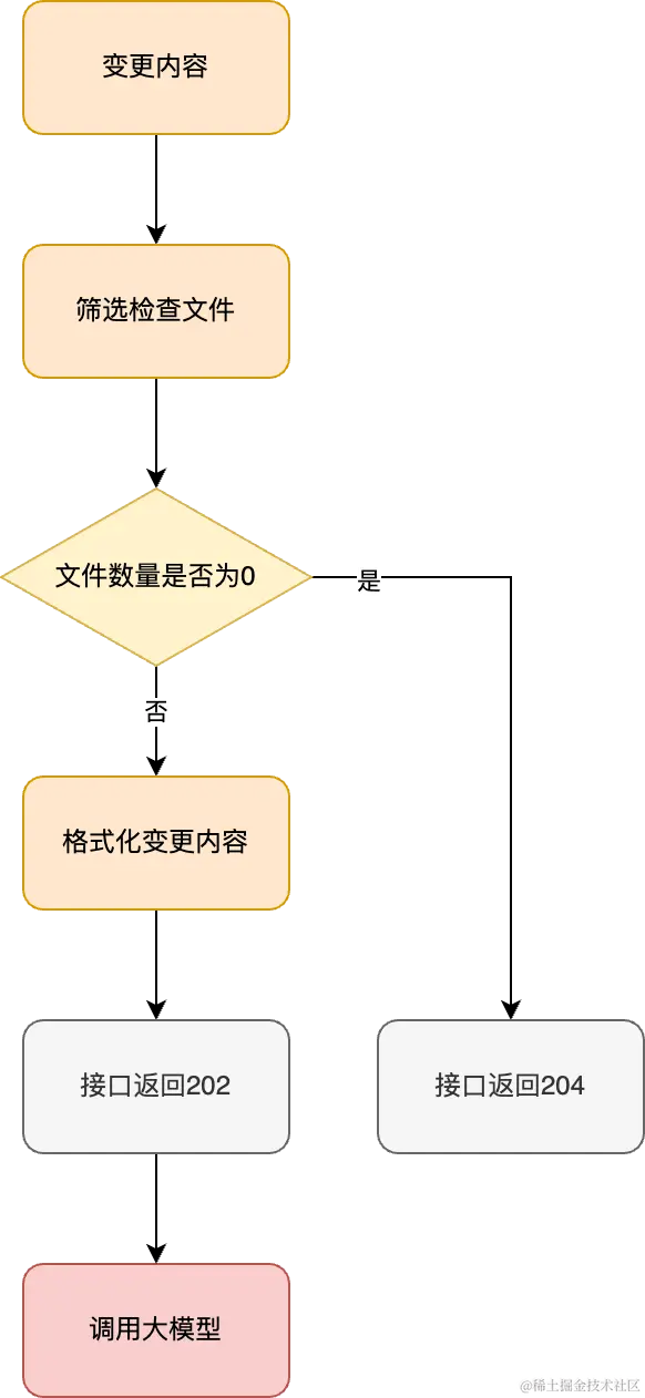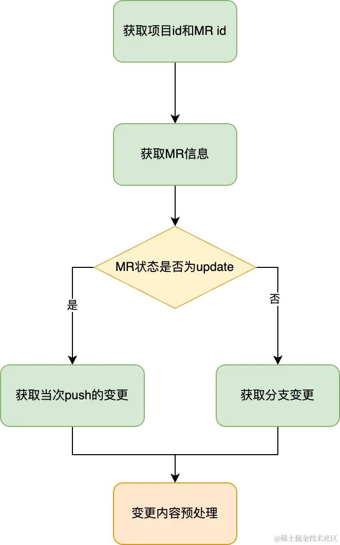 需要补充的是,在初次提交 MR 时和 push 更新代码时都会触发一次 webhook,此时需要根据两种情况进行区分。在初次提交 MR 时获取分支全量变更内容,而在 push 更新代码时只需要获取当次 push 的变更内容,这样就不会重复检查历史变更内容。