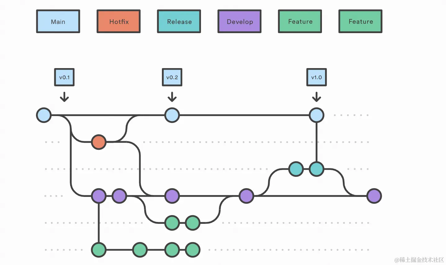 在正常情况下,在一个开发周期不同人员会有多个分支,且整个发布流程会涉及多个辅助分支的合并。以 gitflow 工作流[3]为例,只需要使用正则表达式判断 source_branch 和 target_branch 是否分别是 feature 和 develop,以及 source_branch 是否是 hotfix,即可进入 code review 流程,否则直接返回。