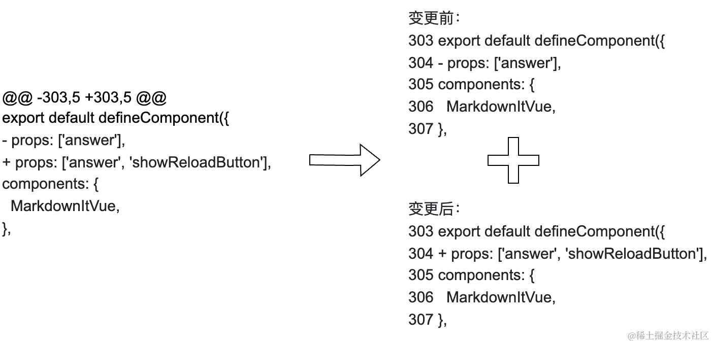 通过观察 4.3 节的 diffs 数组例子可以得知,每个对象对应一个文件,每个 diff 属性中的字符串则是文件中的变更内容,而不同变更之前都有类似@@ -71,6 +71,8 @@的标识。其中-71,6表示变更前代码一共 6 行,从 71 行开始;+71,8表示变更后代码一共 8 行,从 71 行开始。