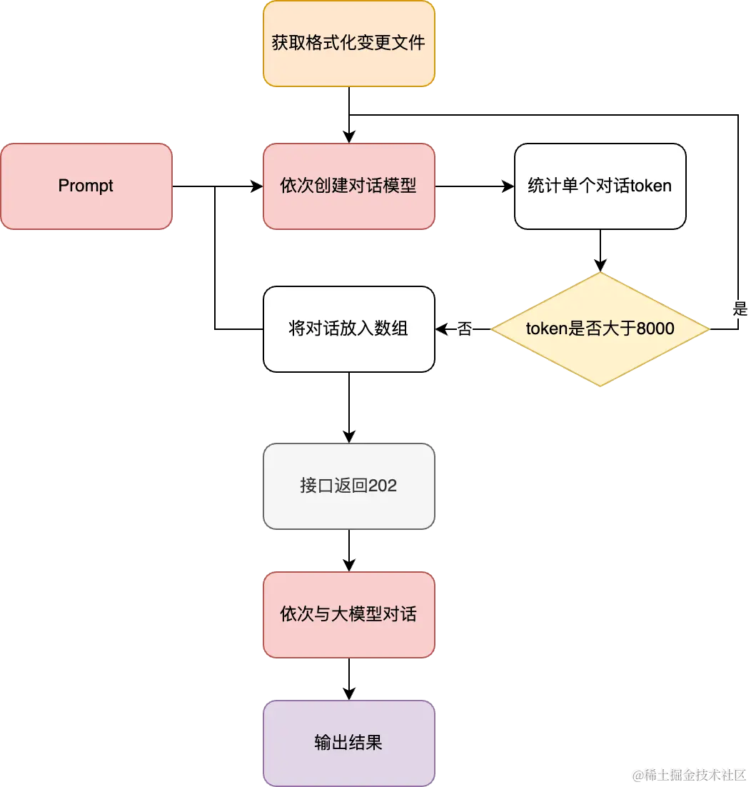 上节获取到格式化后的文件变更字符串,接下来将依赖 Langchain 框架,以文件为粒度调用大模型。经过综合评判,本次采用的大模型为 Chat GPT turbo,上下文窗口为 8000 token[6]。因此在将变更内容传入大模型前,需要单独对每个文件统计 token,若超出限制则直接舍弃。如果超限则接口返回204,不超限则接口返回202,后续持续较长时间的大模型对话放在后台执行。