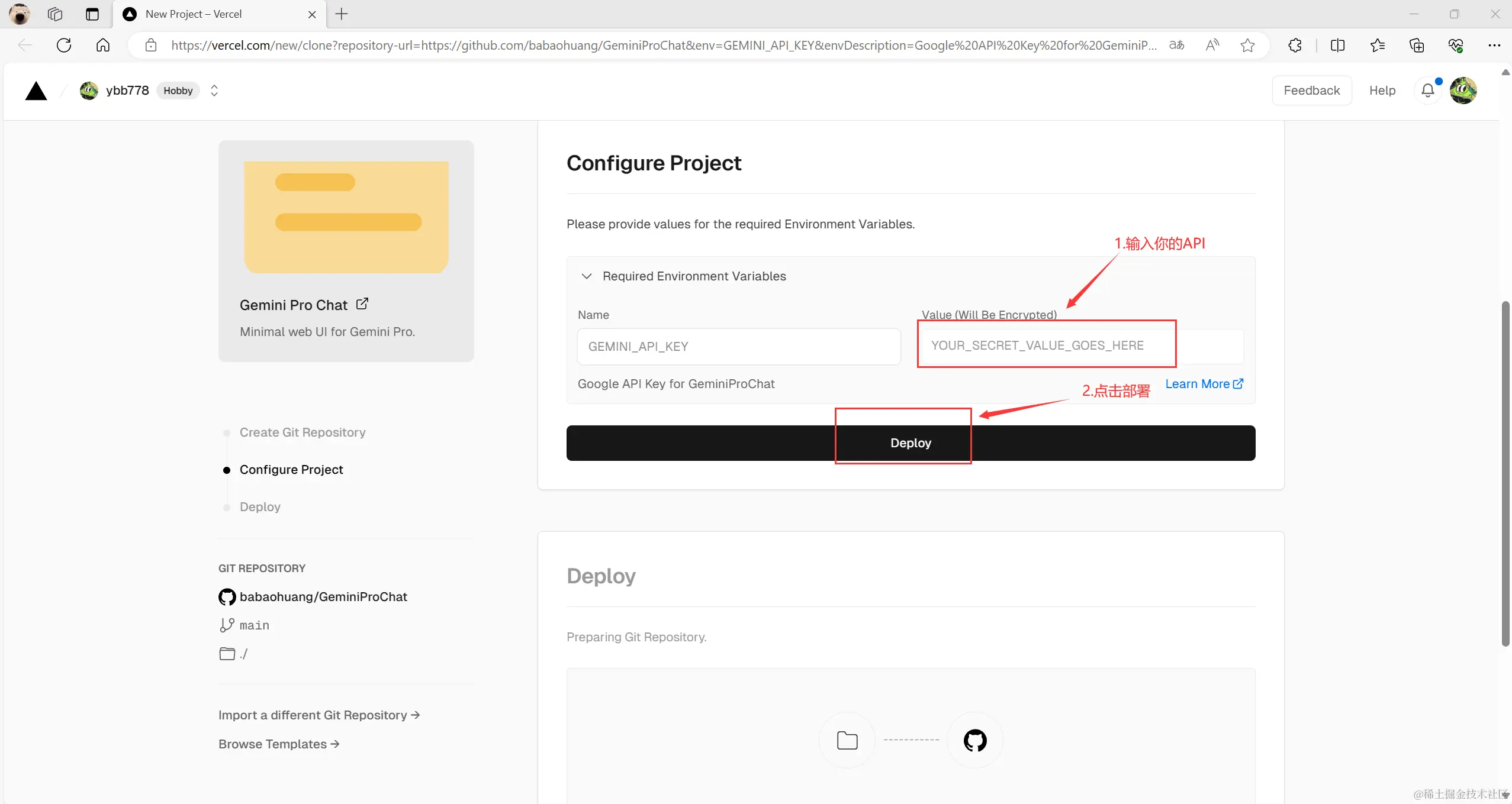 输入你的API 点击Deploy