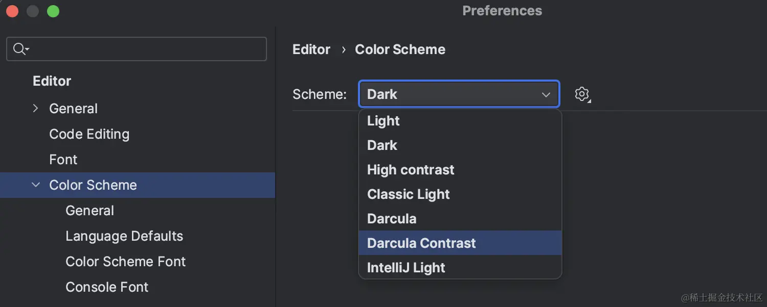 Settings|Preferences|Editor|Color Scheme(设置 | 偏好设置 | 编辑器 | 配色方案)并从列表中选择 Darcula Contrast。