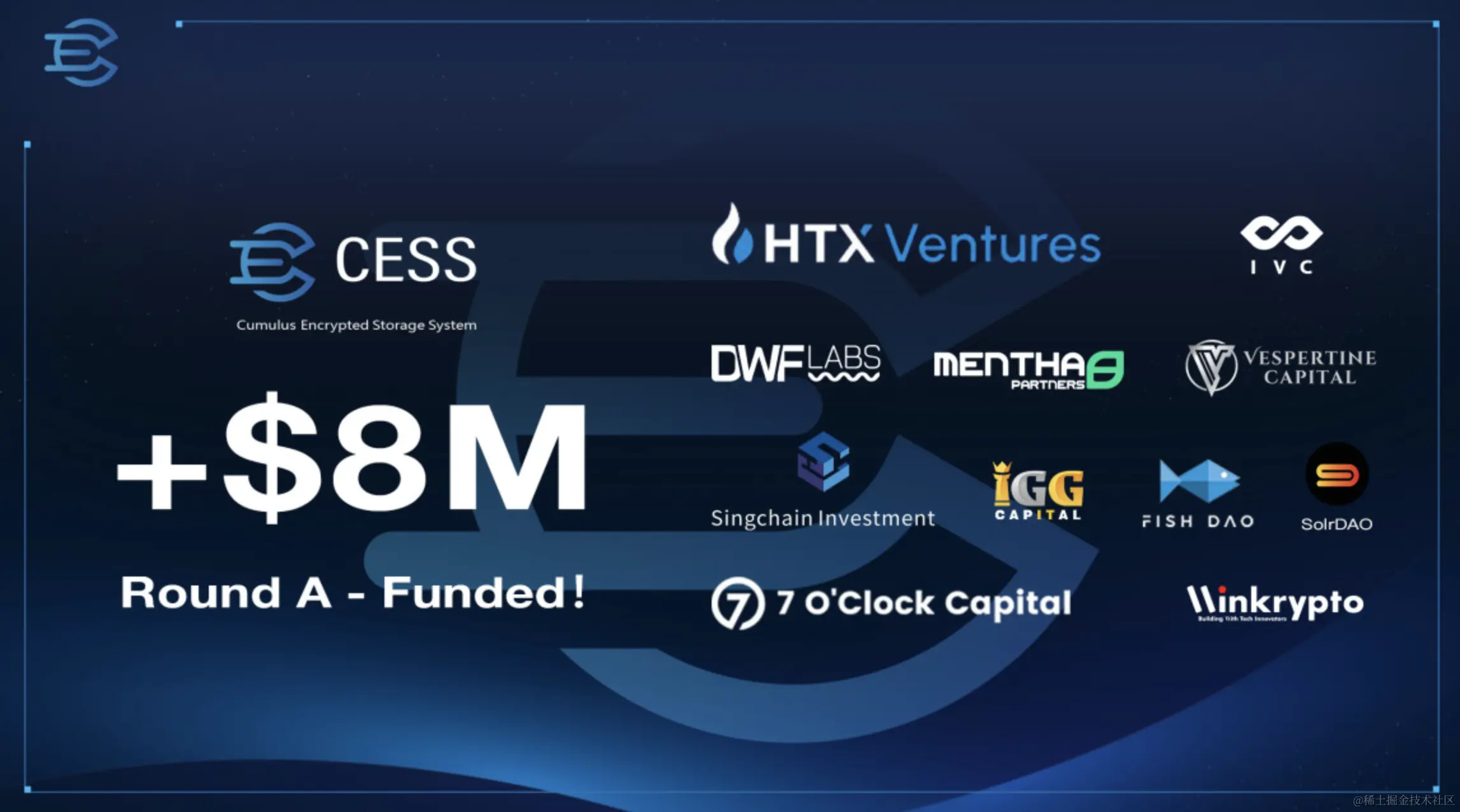**CESS(Cumulus Encrypted Storage System)正式宣布 A 轮融资已成功完成,融资总额高达 800 万美元。**本轮融资由 HTX Venture, Infinity Ventures Crypto, DWF Labs, Mentha Partners, Vespertine Capital, Singchain Investment, 7 O'Clock Capital, SolrDAO, FishDAO, Winkrypto、IGG Capital 等知名投资机构共同参与。