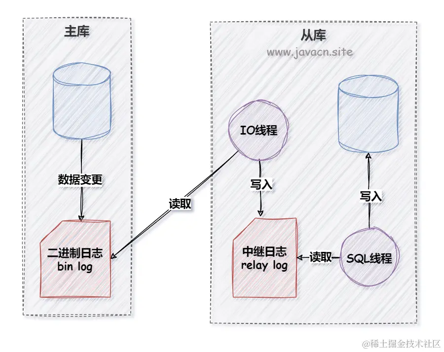 - 从数据库的 SQL 线程会定期从中继日志中获取同步数据,写入到从数据库中。