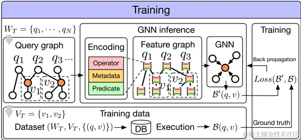 GNN 模型的最终目标是准确地估计使用物化视图 v 来回答图中的查询 q 的好处(即 B(q,v))。为此,首先要创建训练数据。其次,给定特征编码,这篇论文还需要对查询节点和 MV 节点进行适当的表示(或嵌入),以便模型能够很好地捕捉它们之间的关系,从而准确地估计每个 B(q,v)。