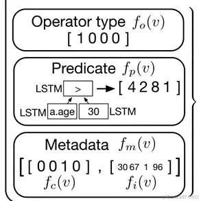 如上图所示,设某个节点与 seq-scan 操作符相关联,该操作符扫描谓词为 a.age>30 的 author 表。这篇论文将运算符类型 seq-scan 编码为独热向量 fo(v),其中 seq-scan 的对应位置具有值 1。谓词 a.age>30 可以表示为表达式树,其中根节点>具有两个子节点 a.age 和 30。这篇论文通过树-LSTM 模型将该表达式树编码为嵌入向量 fp(v)。元数据包含作者、年龄列、扫描成本、行和宽度。这篇论文将其编码到向量 fm(v)中,该向量包含一个独热向量,其中列 a.age 的对应位置具有值 1 和其他统计信息。
