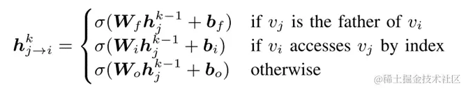 针对上述问题,这篇论文设计了一个 MV 聚合器,用于在查询图上进行特征聚合,该聚合器处理父节点、索引节点和其他具有不同线性变换的节点,分别表示为(WF, BF)、(WI, BI)、(WO, BO)。如图 4 所示,依赖于 WF、WI、WO,邻居将在聚合中向节点传播不同的特性。形式上,这篇论文将传播的特性定义为: