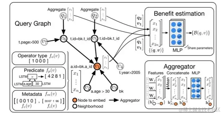 给定收集的用于离线训练的工作负载 WT,通过合并工作负载中查询的查询树来构建查询图。接下来,对图中每个节点的特征(例如,操作符类型、元数据、谓词)进行提取和编码,生成一个特征图。并设计了一个聚合函数来聚合每个节点邻居的特征并生成节点嵌入。