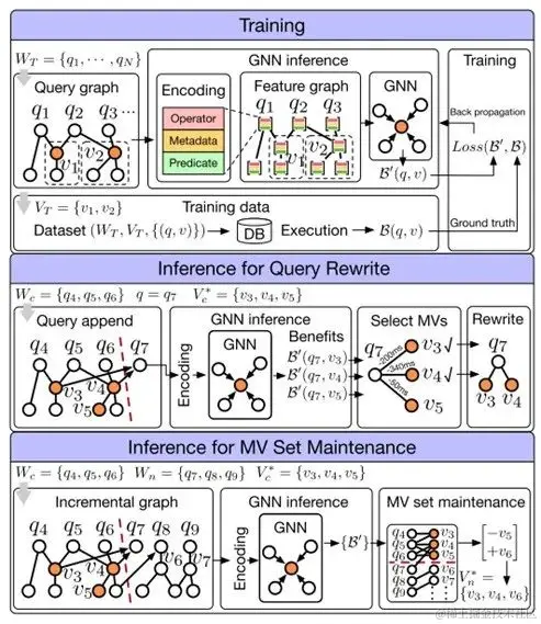 GnnMV 由三个模块组成,即离线 GNN 模型训练、用于查询重写的在线 GNN 推断以及用于 MV 集合维护的 GNN 推断。