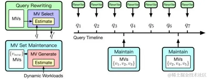 这篇论文考虑一个常见的场景,查询在很长一段时间内连续出现,即动态工作负载。由于查询分布可能发生变化,使用这些固定的 MVs 来优化后续查询的方法不是最优的。因此,这篇论文建议随着新的工作负载的到来,不断迭代地更新 MVs,以应对不断出现的可能的分布转移的查询,这样所有的查询都可以在一段时间内得到很好的优化。