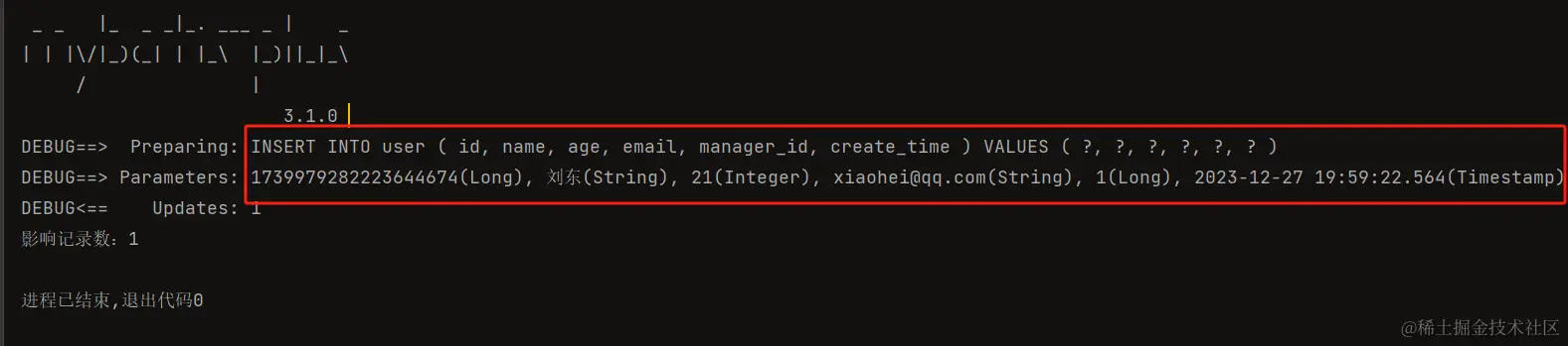 注意:我们在set中并没有插入id,但是运行结果成功插入了一串id值,因为这是mybatis-plus基于雪花算法实现的自增id。