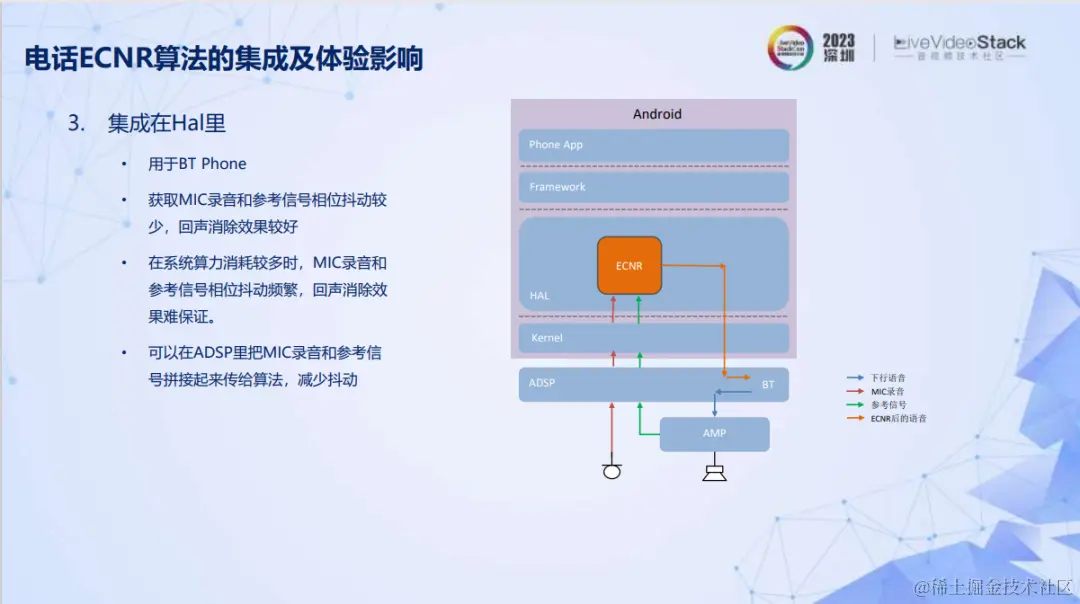 另一个方案是集成在Hal层,这种方案更为常见,一般车体里的蓝牙电话就会用到这种方法。这个方法经过的层级比较少,Kernel运行的性能较为稳定,所以这个方案相位对齐较好,回声消除效果也较好。这个方案的劣势是,在CPU算力消耗比较高的情况下,Hal层的进程也会受到影响,这时它的相位抖动和回声消除效果也难以保证。