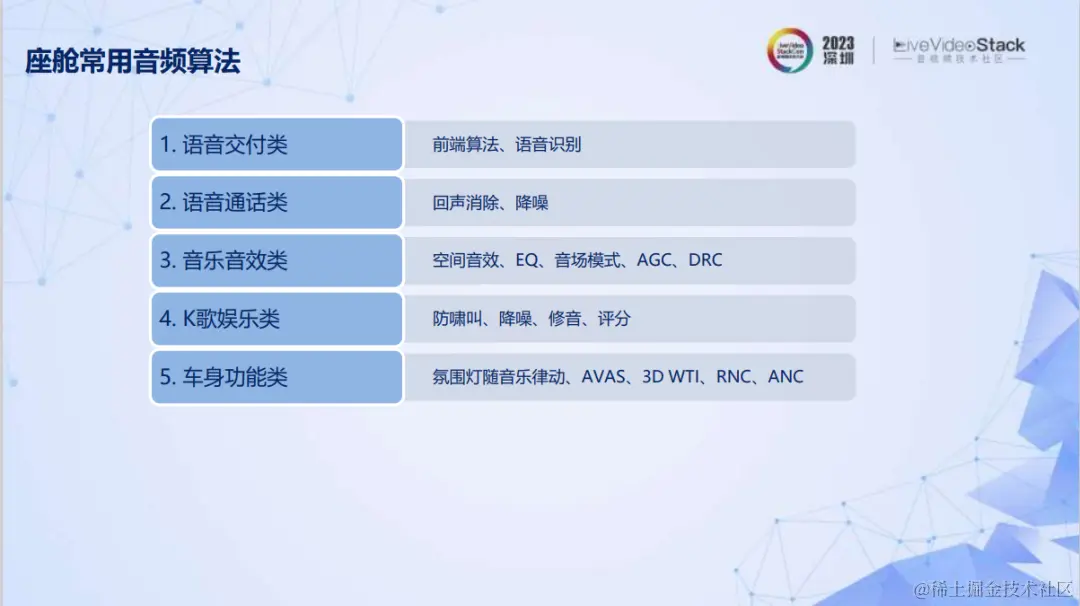 从系统的角度出发,目前座舱常用的音频算法可总结为五类。第一是语音交付类,目前使用较广的是前端的算法、语音识别的算法;第二是语音通话类,包括回声消除、降噪(即ECNR)等功能;第三是音乐音效类,包括了空间音效和Dolby全景声、音场模式、AGC、DRC等算法;第四是K歌娱乐类,包括防啸叫、降噪、评分、修音等功能;最后是与车身功能相关的功能,例如氛围灯随音乐律动、AVAS、3D WTI、RNC、ANC,以及主动降噪等功能。