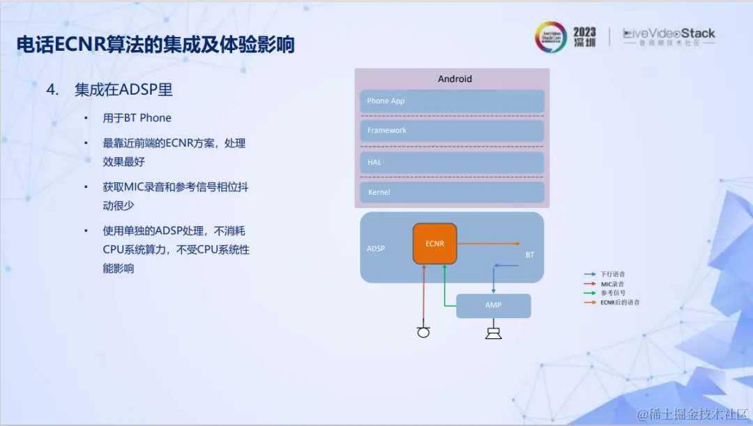 第三种方案是集成在音频专用的DSP中,例如ADSP中。这是最靠近录音前端的一个方案,也是最优的方案,适用于蓝牙通话。