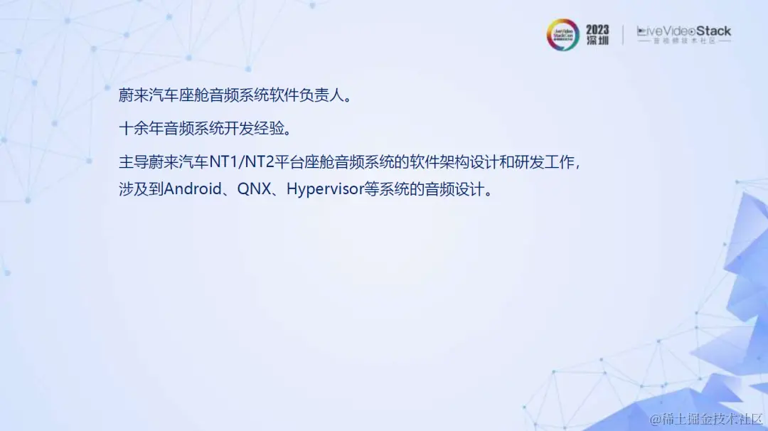 大家好,我是高林,蔚来汽车座舱音频系统软件负责人,拥有十余年音频系统开发经验。