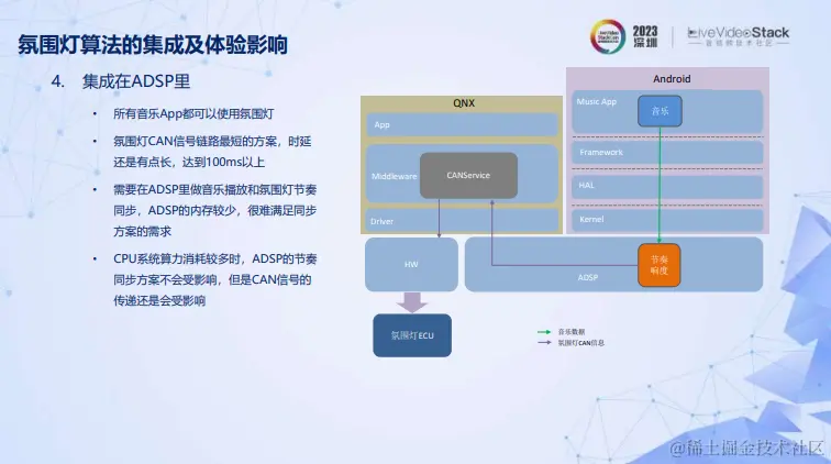 CAN信号的传输路径在系统内部比较长,再通过CAN总线传到ECU上,信号的延时就更长。这种方案因为集成在APP中,所以只有单个APP才能使用氛围灯的节奏同步。整个的CAN信号传输链路,目前可以达到200毫秒,虽然它目前也有很多约束性条件,例如它的同步算法需要在APP里进行,同时如果CPU系统算力消耗过多,音乐和氛围灯的节奏就会出现不同步现象。