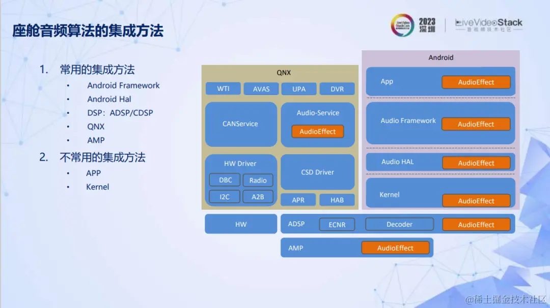 从系统的层面来讲,常用的集成方法是集成在Android Framework中。音效类的可以集成在Framework、APP、 HAL、Kernel、ADSP中,功放里面也可以集成一个音效算法。在QNX系统中,也可以有专门的Audio-Service来处理,它也可以集成一些音效算法。