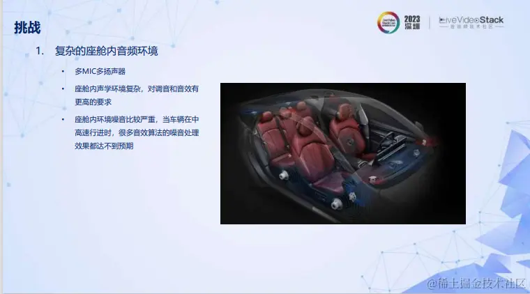 第一个挑战是复杂的座舱内音频环境。与座舱相比,手机的音频硬件环境更为简单。主要表现为手机对MIC和喇叭的数量有一定限制,通常为两到三个。然而,车舱的MIC数和扬声器数则越来越多,对音频算法的要求也越来越高。同时,座舱内的声学环境也比较复杂,尤其是车辆在中高速公路行驶的过程中会产生大量噪音,手机的算法挪用到车舱时对噪音的处理无法达到用户的需求。许多厂商在尝试各种方式来降低噪音或提升音效体验,但目前音效算法的噪音处理效果大多无法满足需求。