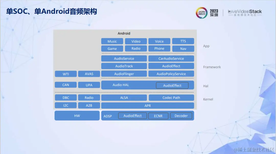 常用的算法会集成在Framework、HAL、DSP、功放、QNX中,APP和Kernel则不是系统算法常用的集成方法。如果集成在单个APP中,可能只有单个的APP才能使用,不符合厂商车机的需求。如果集成在kernel中,由于Kernel是一个比较完整的系统,可能不符合架构上的需求,对Kernel影响比较大,所以不常用。
