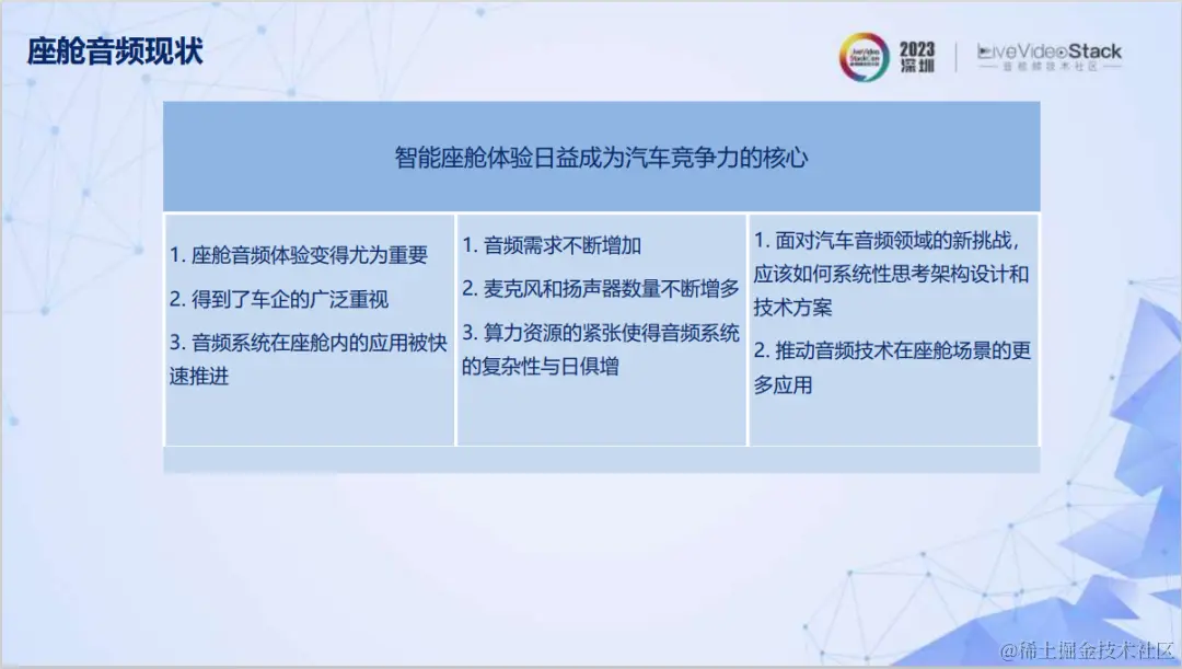 接下来正式进入今天的主题。今天的主题分为三部分:首先介绍目前智能座舱的主流音频架构设计,其次分析智能座舱音频算法集成方案以及体验影响,最后再谈音频体验与整车功能融合方面的挑战。