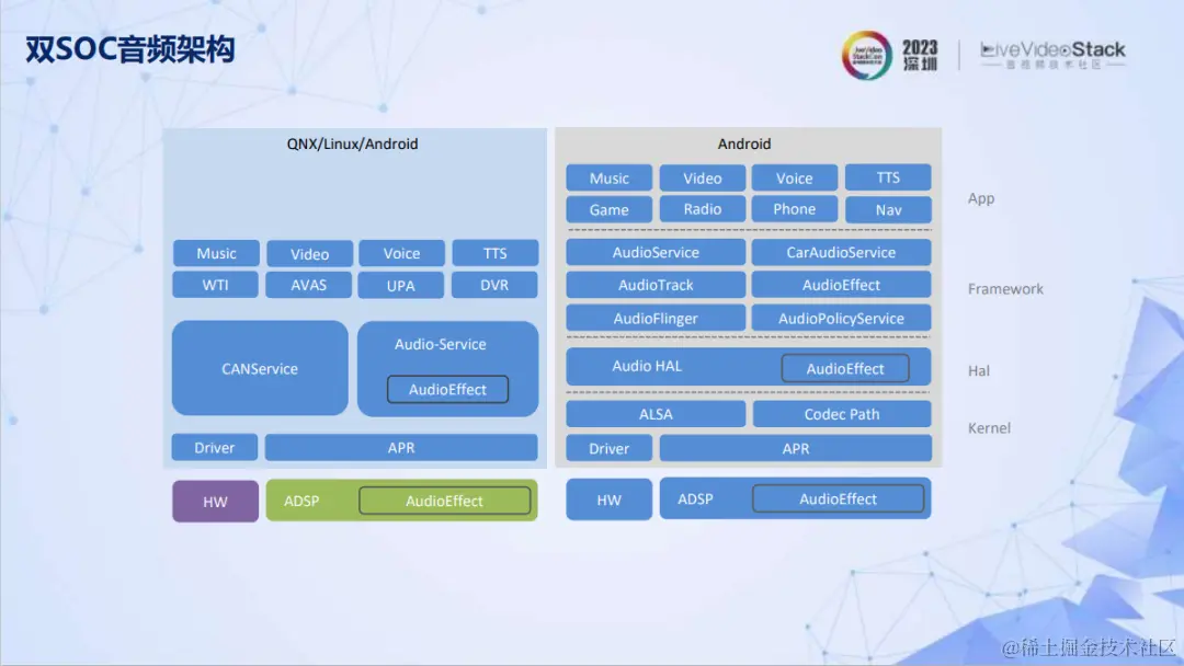 单SOC的两个系统之间通过Hypervisor这一虚拟的通信机制进行通信。底层有专门给Audio(音频)提供算法运行的单独的处理单元,即ADSP,这也是大多数SOC厂商提供的架构。