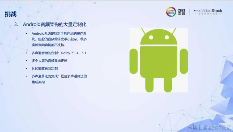 第二个挑战是复杂的座舱音频需求。一方面,随着座舱内部的MIC和扬声器数越来越多,手机的音频算法挪用到车机时无法满足处理需求,所以需要对算法进行重新开发和适配。同时,许多Android APP希望能在座舱内适配和落地。因此,对音频需求的落地速度和落地质量要求也越来越高。