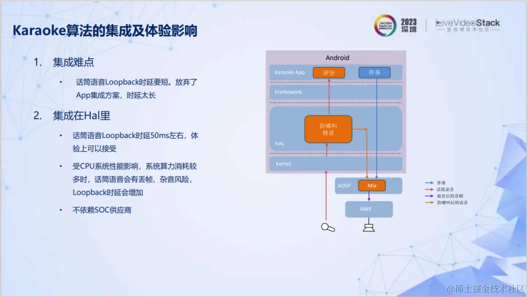 方案一是集成在Hal中。如图所示,Karaoke的APP中带有评分算法,用户能够播放伴奏,用话筒录音,通过防啸叫和修音算法,然后分出一路传到APP上评分,另一路传到ADSP,从AMP功放播出。这是集成在Hal的方案,当然也可以选择集成在APP中,但是因为延时太长,目前各个厂商都放弃了这种方案。