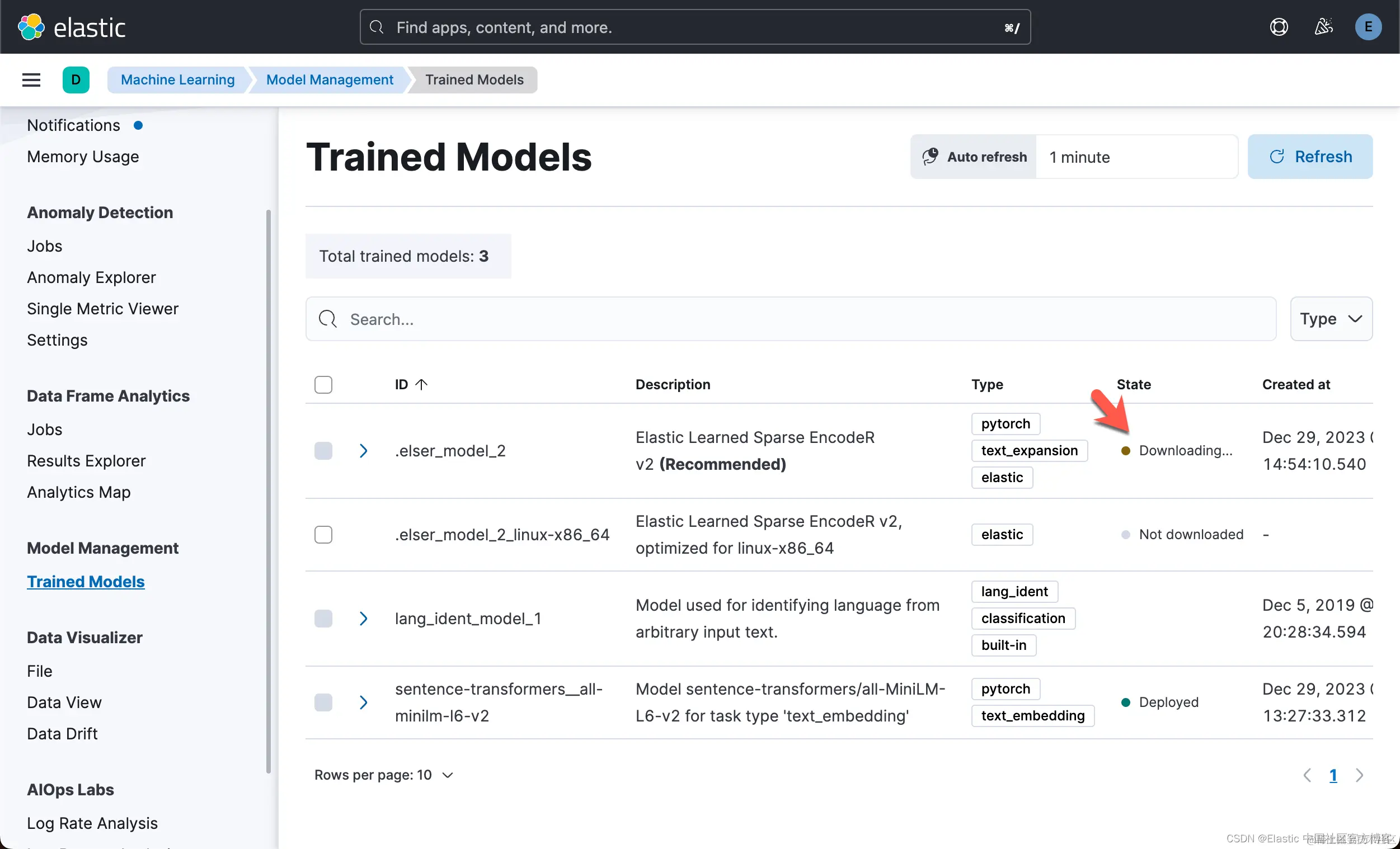 上面显示, .elser_model_2 正在被下载。我们需要等一段时间才能下载完毕。这个依赖于你自己的网路速度。使用以下命令检查模型下载的状态。