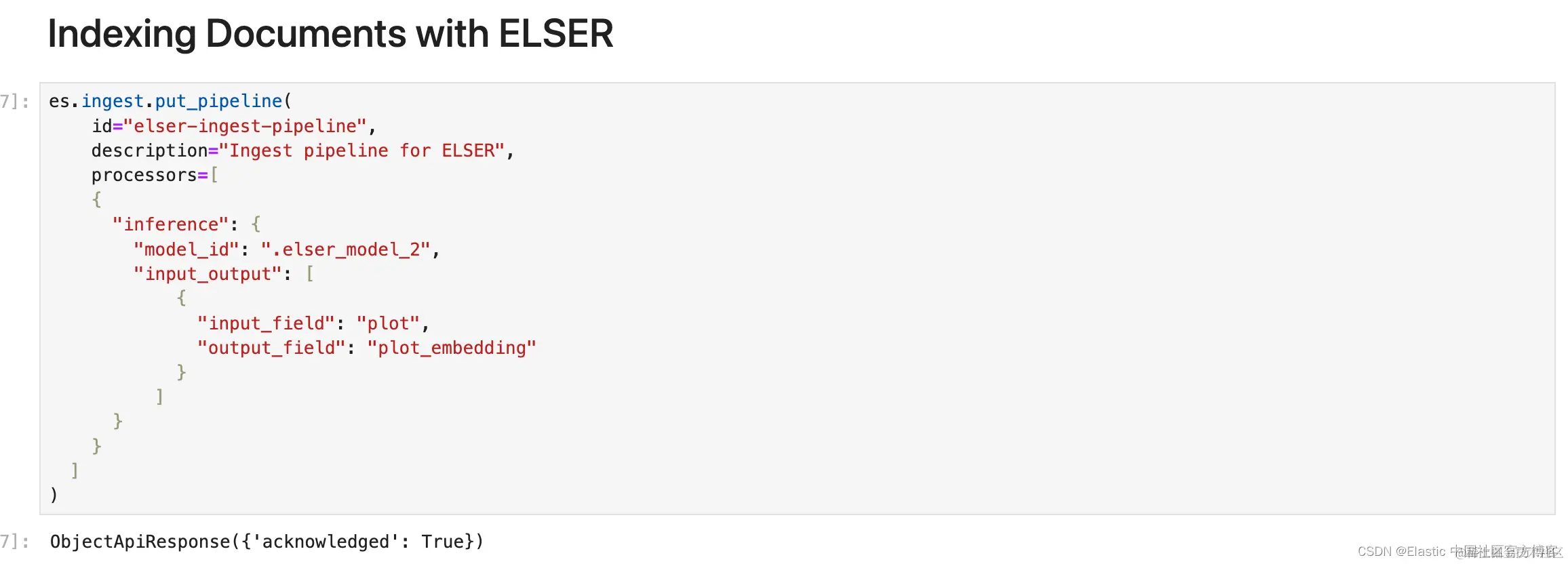 为了在我们的 Elasticsearch 中使用 ELSER,我们需要创建一个包含运行 ELSER 模型的推理处理器的摄取管道。 让我们使用 put_pipeline 方法添加该管道。