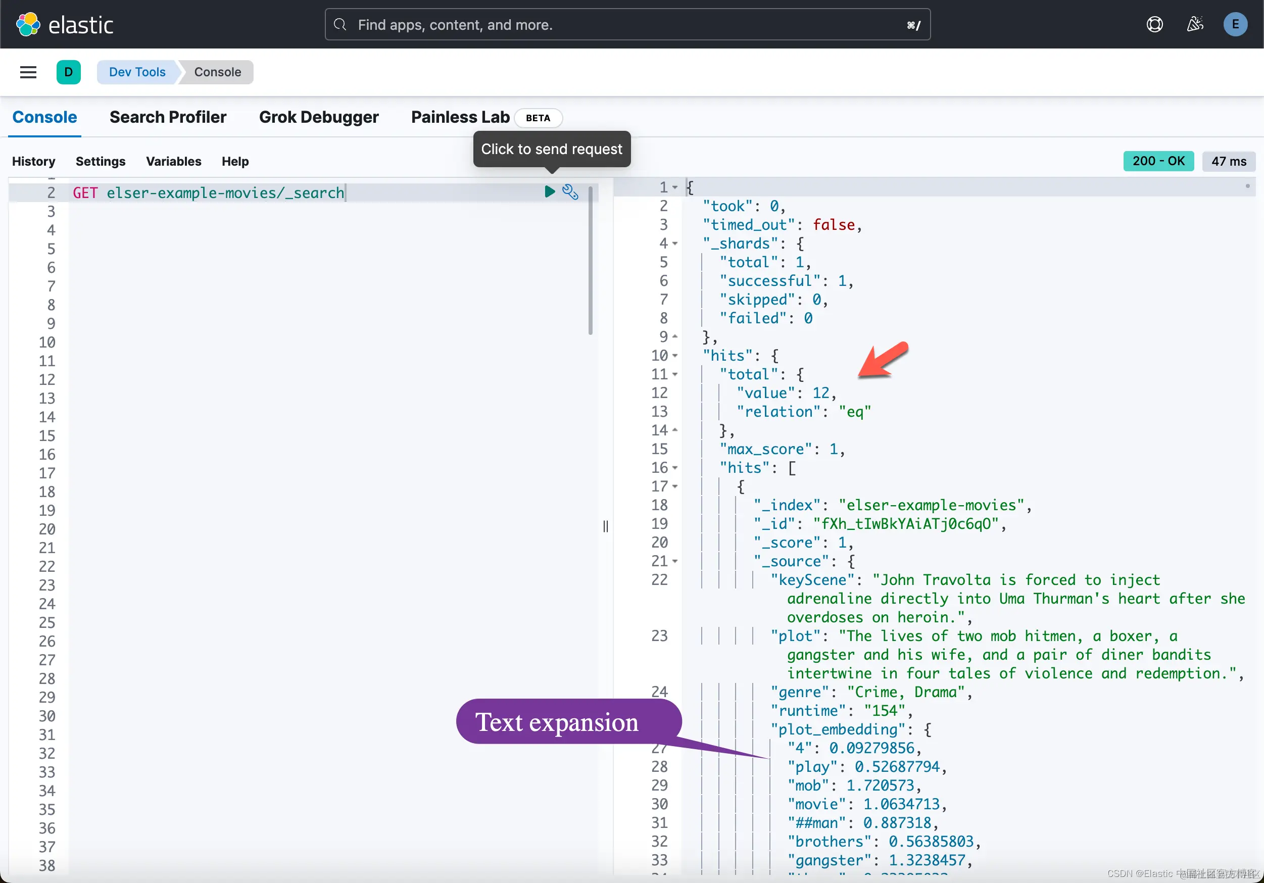 检查新文档以确认它现在有一个 plot_embedding 字段,其中包含新的附加术语列表。 这些术语是创建管道时在 input_field 中用于 ELSER 推理的目标字段的文本扩展。 ELSER 实质上创建了一个扩展术语树,以提高文档的语义可搜索性。 我们将能够使用 text_expansion 查询来搜索这些文档。我们可以在 Kibana 中查看: