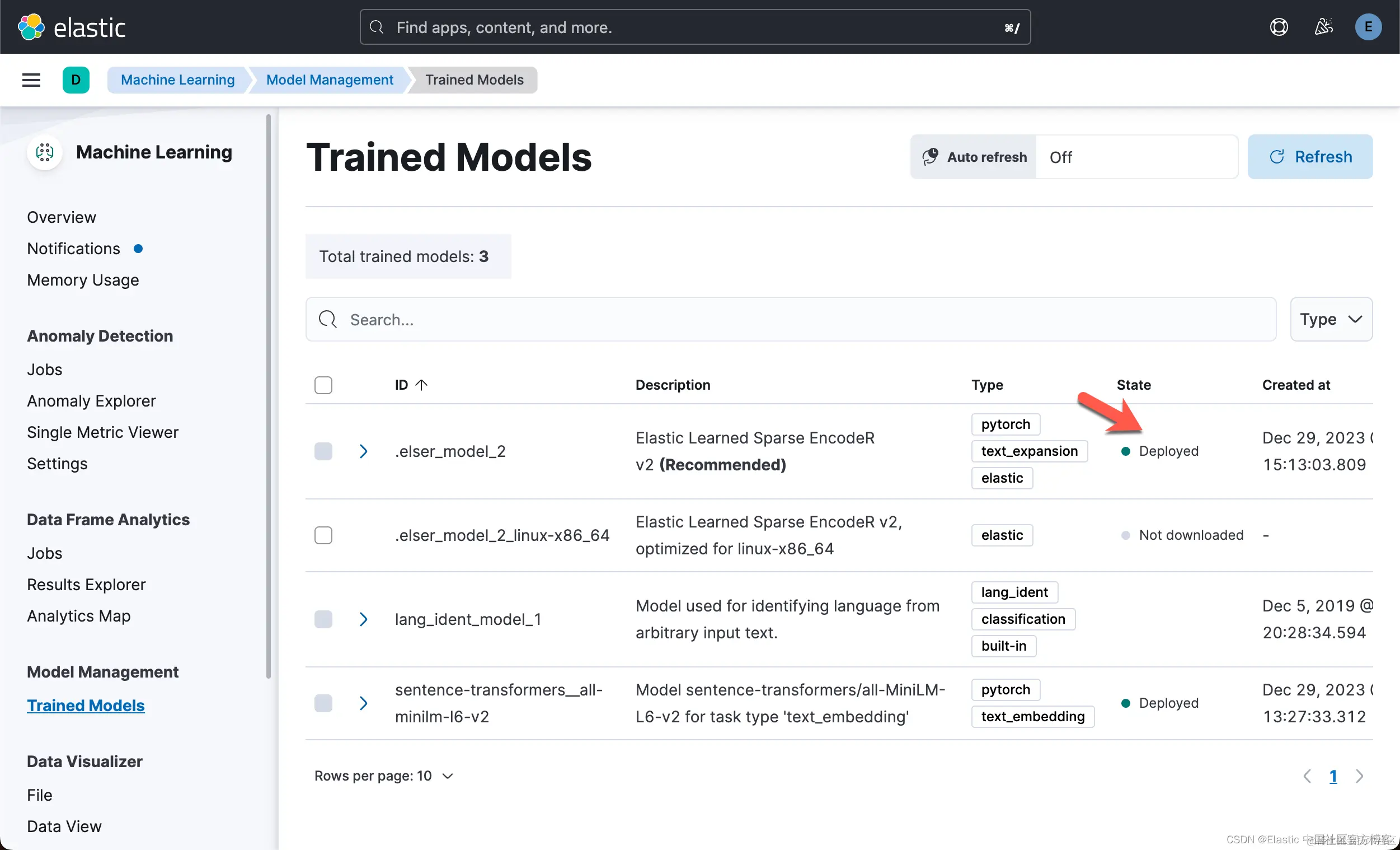 如上所示,在 Kibana 的界面中,我们可以看到 .elser_model_2 已经被成功地部署了。我们可以使用如下的代码来查看状态: