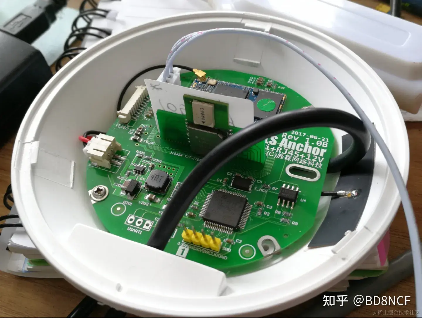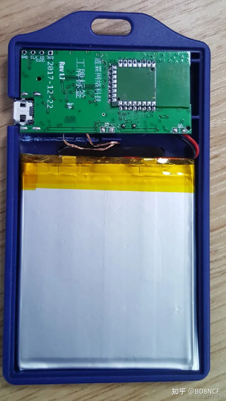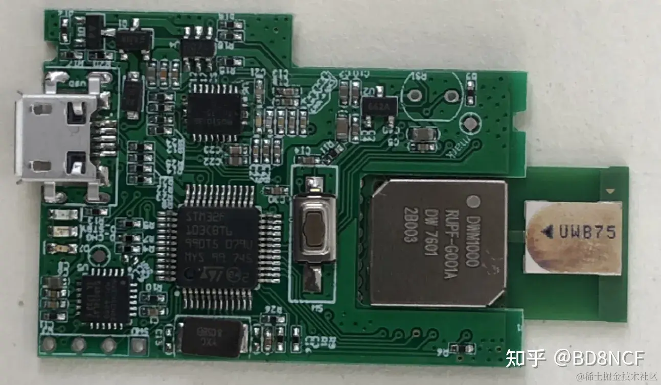 还值得提一下的是,因为工牌很薄,为了节省空间,DWM1000是从背面焊接的。如果从正面焊,PCBA要高些。