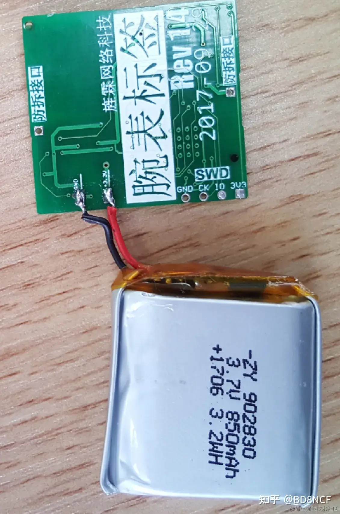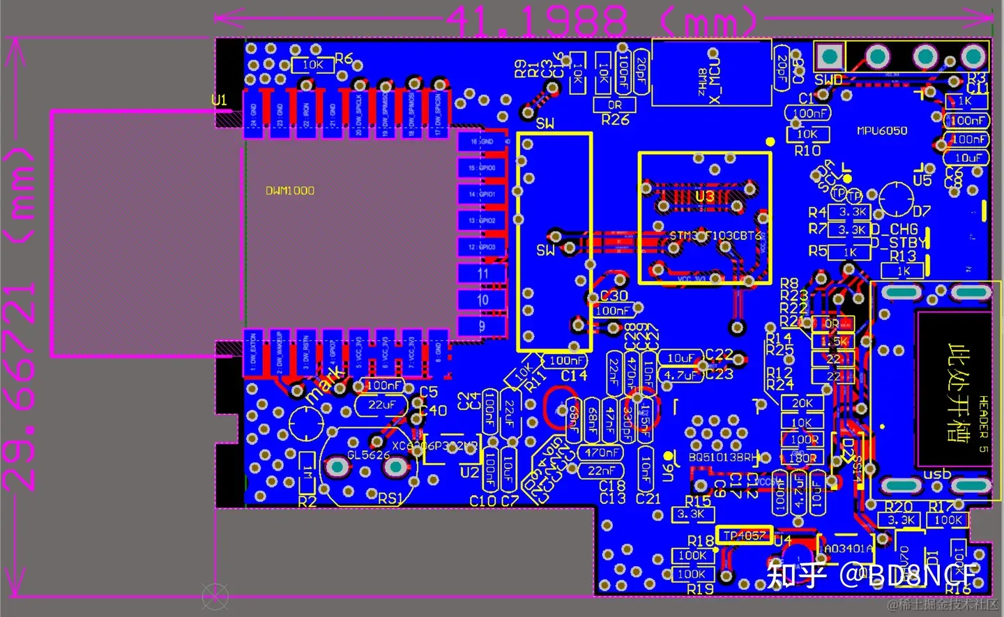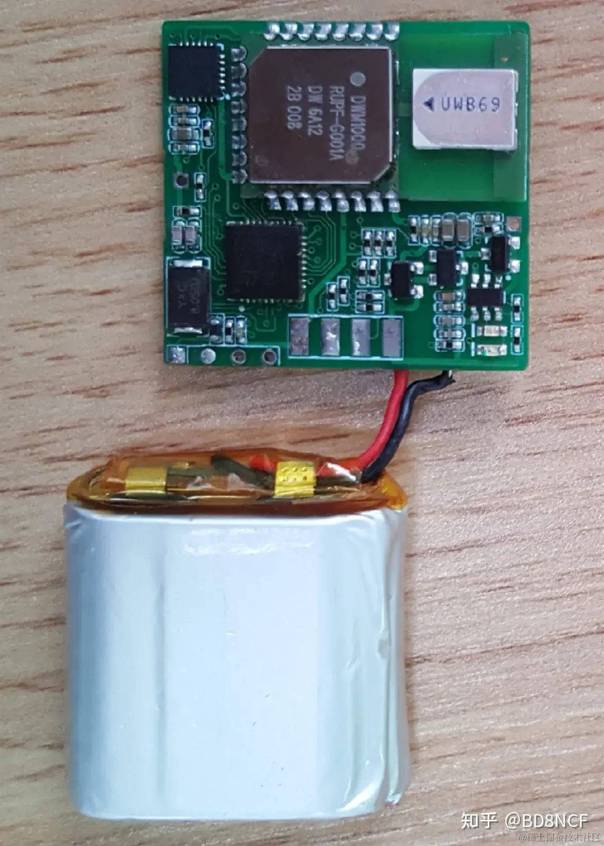 还值得提一下的是,因为工牌很薄,为了节省空间,DWM1000是从背面焊接的。如果从正面焊,PCBA要高些。
