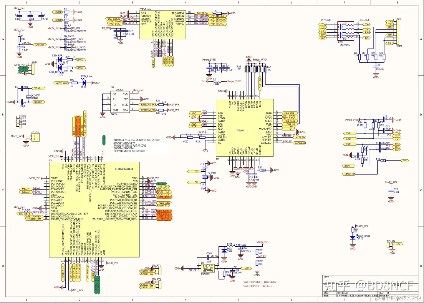 MCU的选型。我们使用的主控MCU是STM32F103系列,这个系列的芯片在几年前非常的火。如果是现在选型,我肯定是选ESP32。ESP32又便宜,性能又好,扩充性也强。2020年左右的时候,ST的芯片涨价,我们深受其苦。我们定位基站用的STM32F103RET6,正常价格也就14元左右,最高的时候涨到500元左右,比我们的基站出货价格还高,好疯狂。