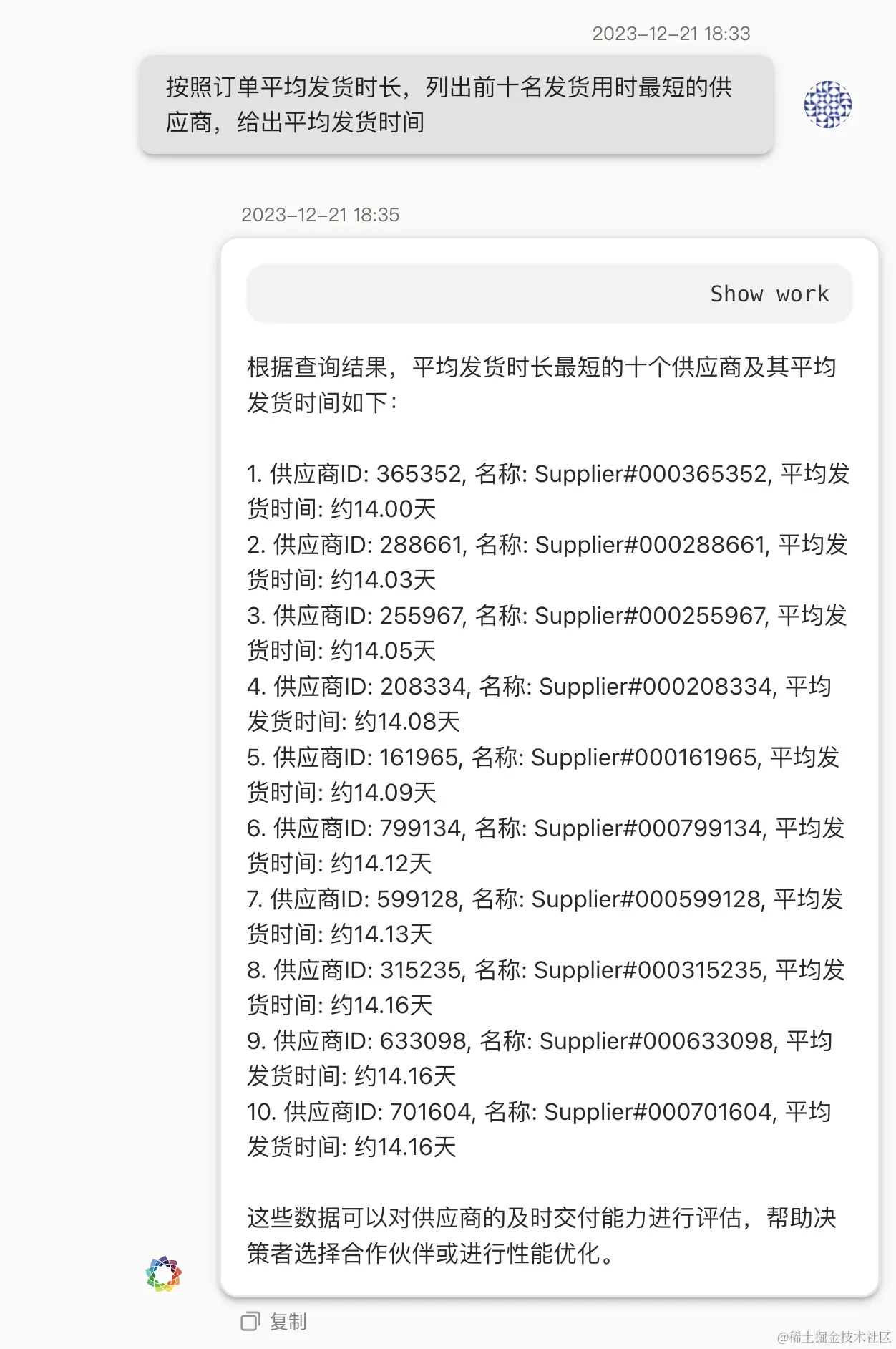 提问一个复杂的问题:按照供应商发货时长,列出前十名。先要统计每个订单的时间,订单详情发货时间,然后统计每个供应商供应数量,再排序,可以看到直接通过AI自己通过对Starrack的访问统计出来并返回结果。
