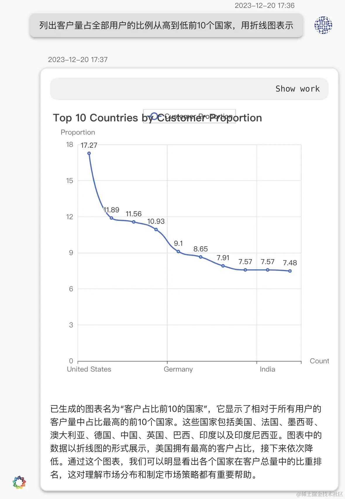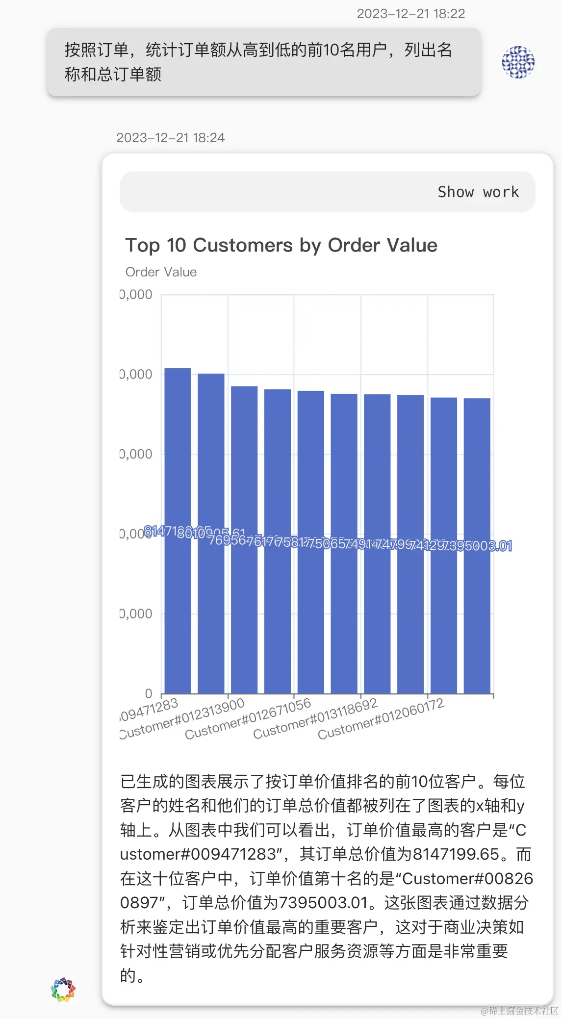 1 对话式数据分析:用户可以通过对话,得到任意的数据结果和分析结果。