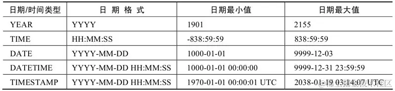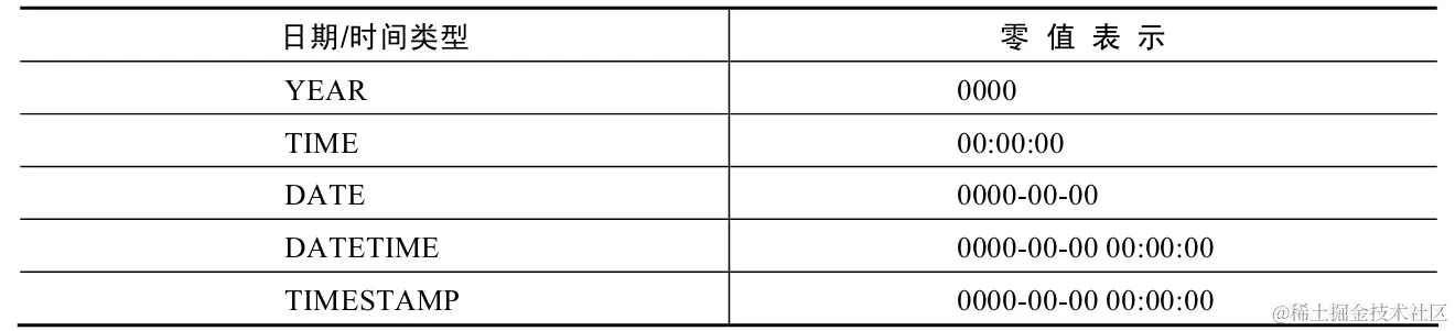 每种日期和时间类型都有一个有效值范围,如果超出范围,则会以0进行存储,以下是零值表示