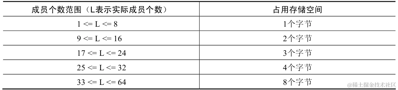 SET表示一个字符串对象,可以包含0~64个成员,根据成员个数的不同,所占用存储空间也是不同的。以下为SET类型所占空间