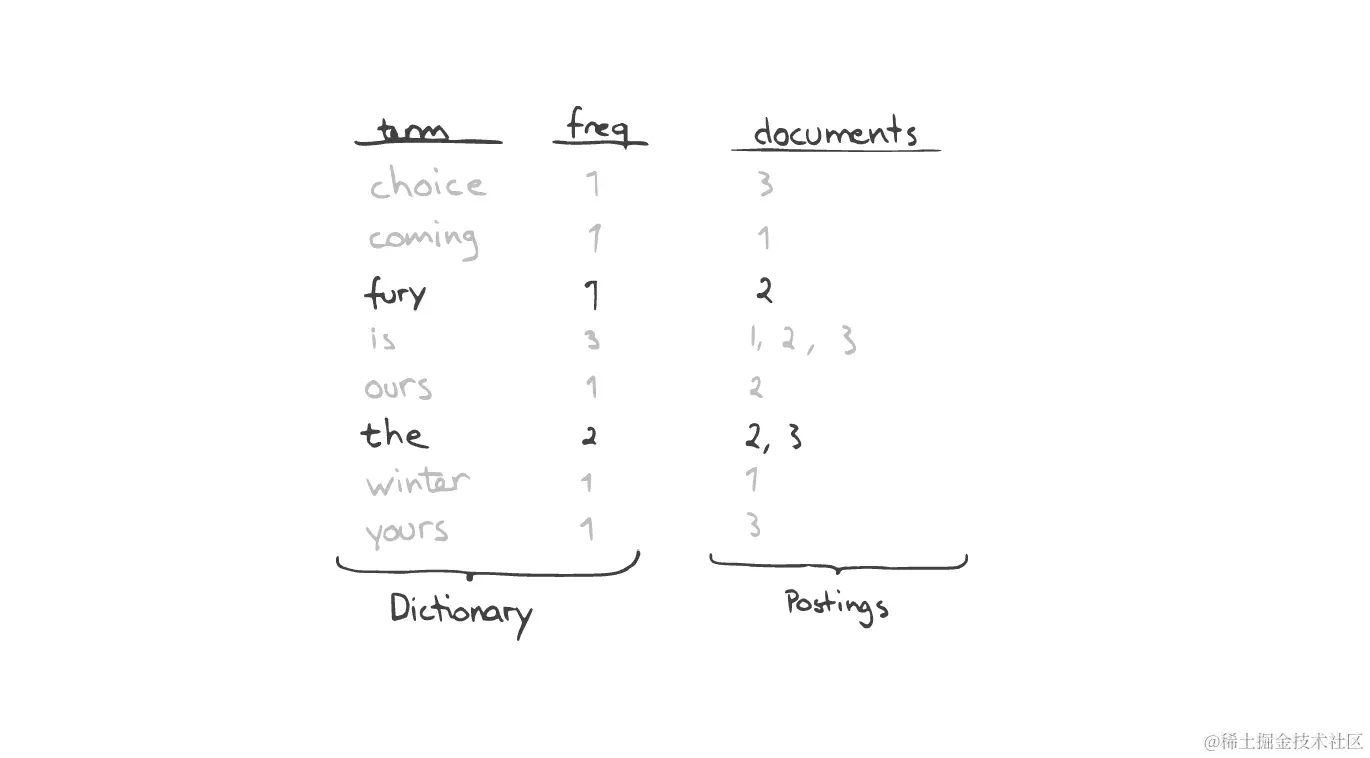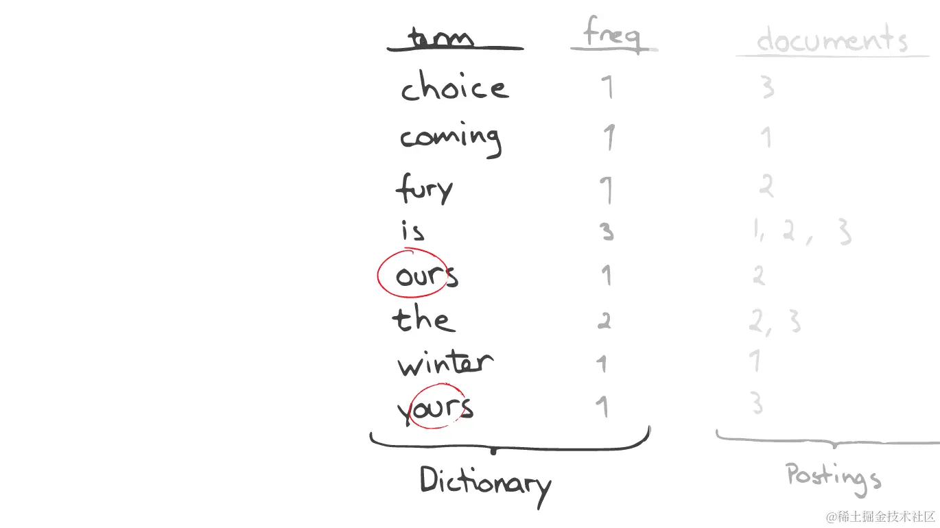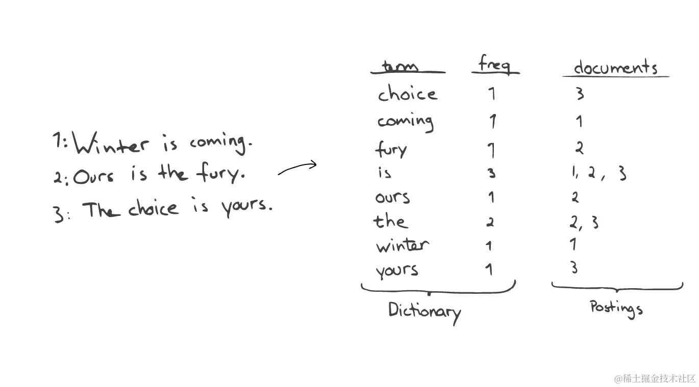 - 与单词Term对应的Postings list(即存在这个单词的文件)。