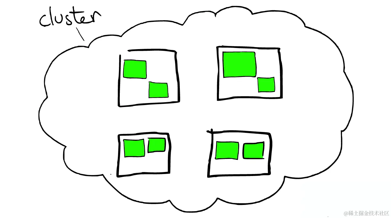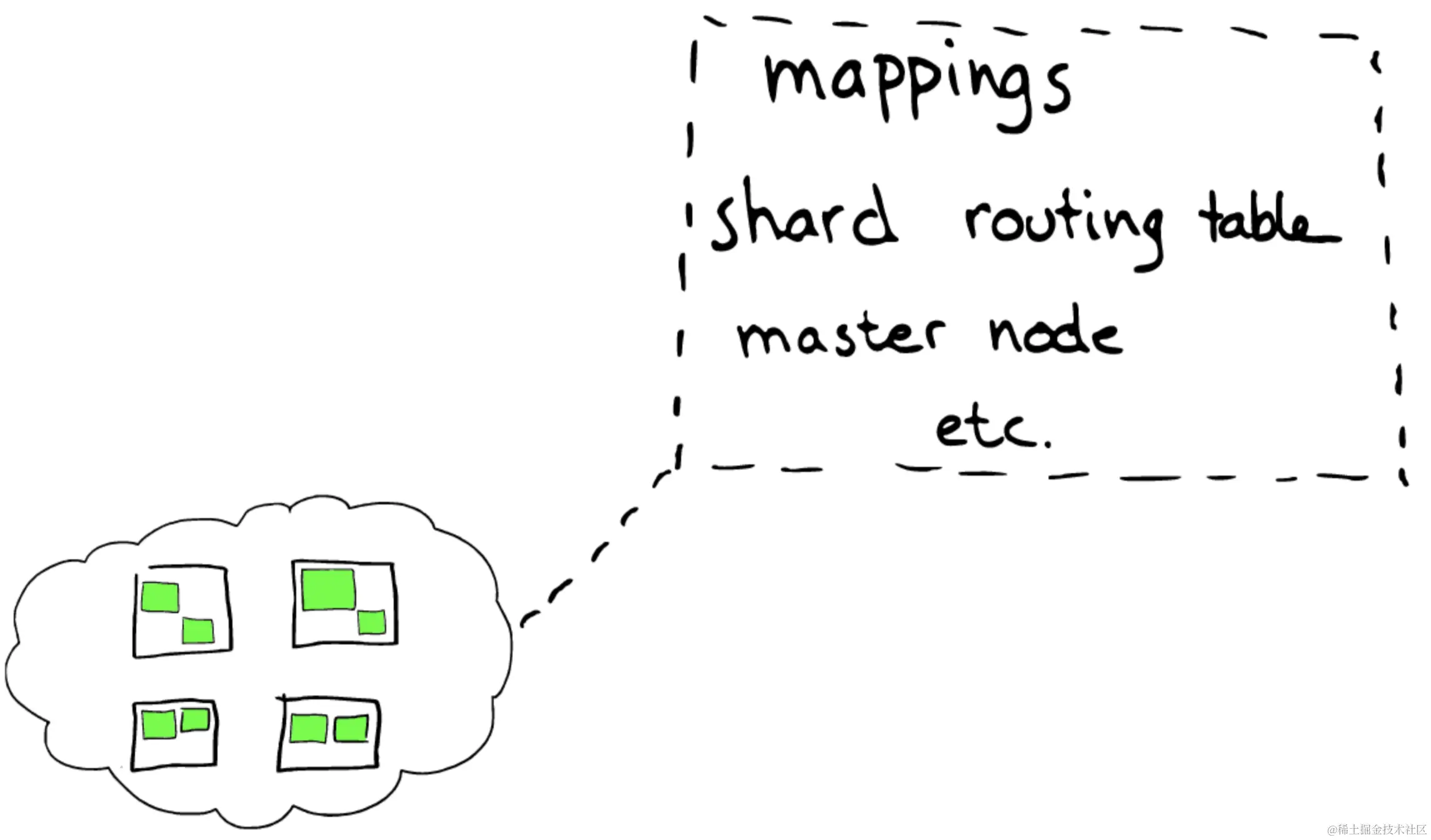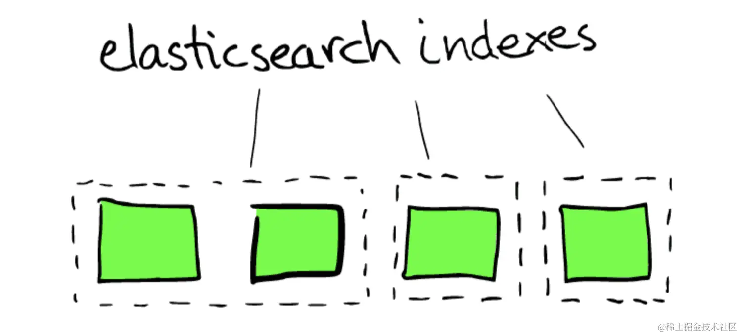 在一个或者多个节点直接,多个绿色小方块组合在一起形成一个Elasticsearch的索引